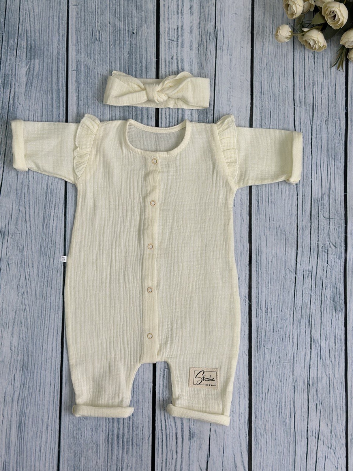 Купить оптом 336-СЛ. Комбинезон с повязкой для девочки из муслина, хлопок 100%, размеры 56,62,68, сливочный в Железноводске