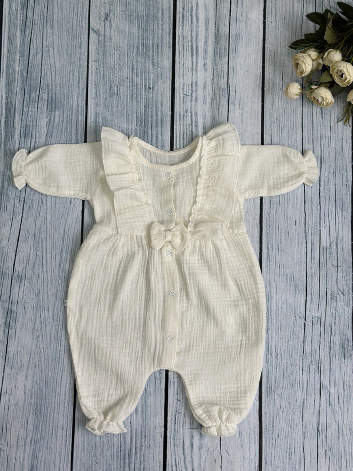 337-МО. Комбинезон с бантом для девочки из муслина, хлопок 100%, размеры 56,62,68, молочный